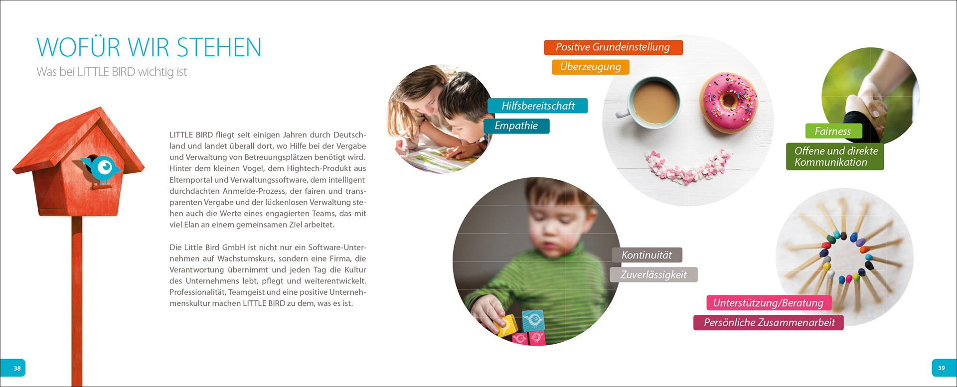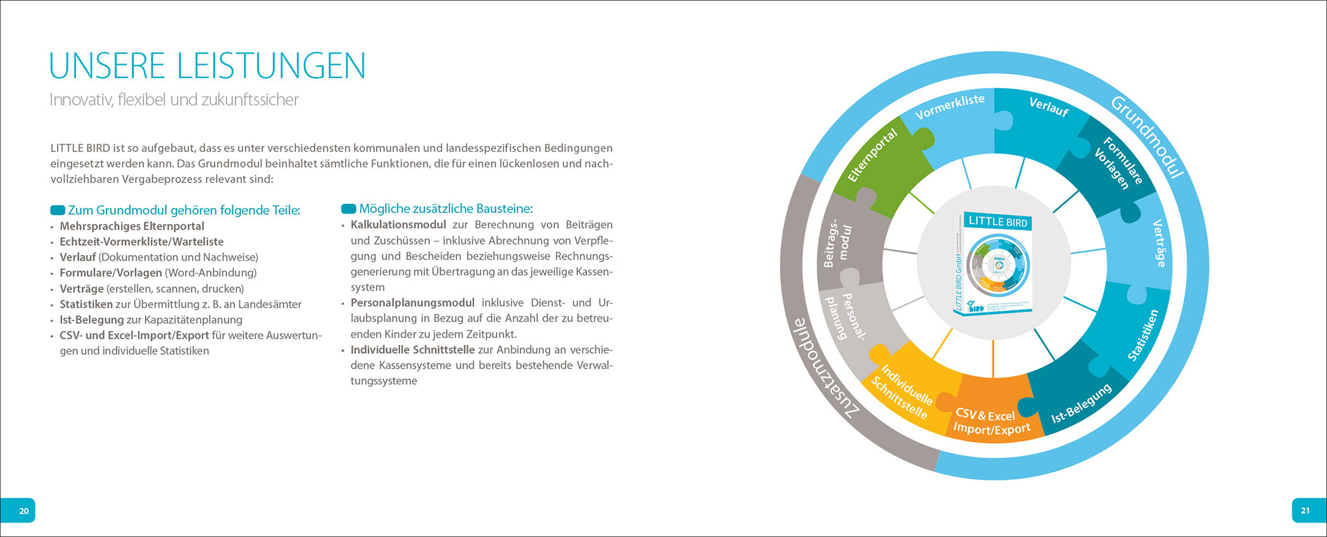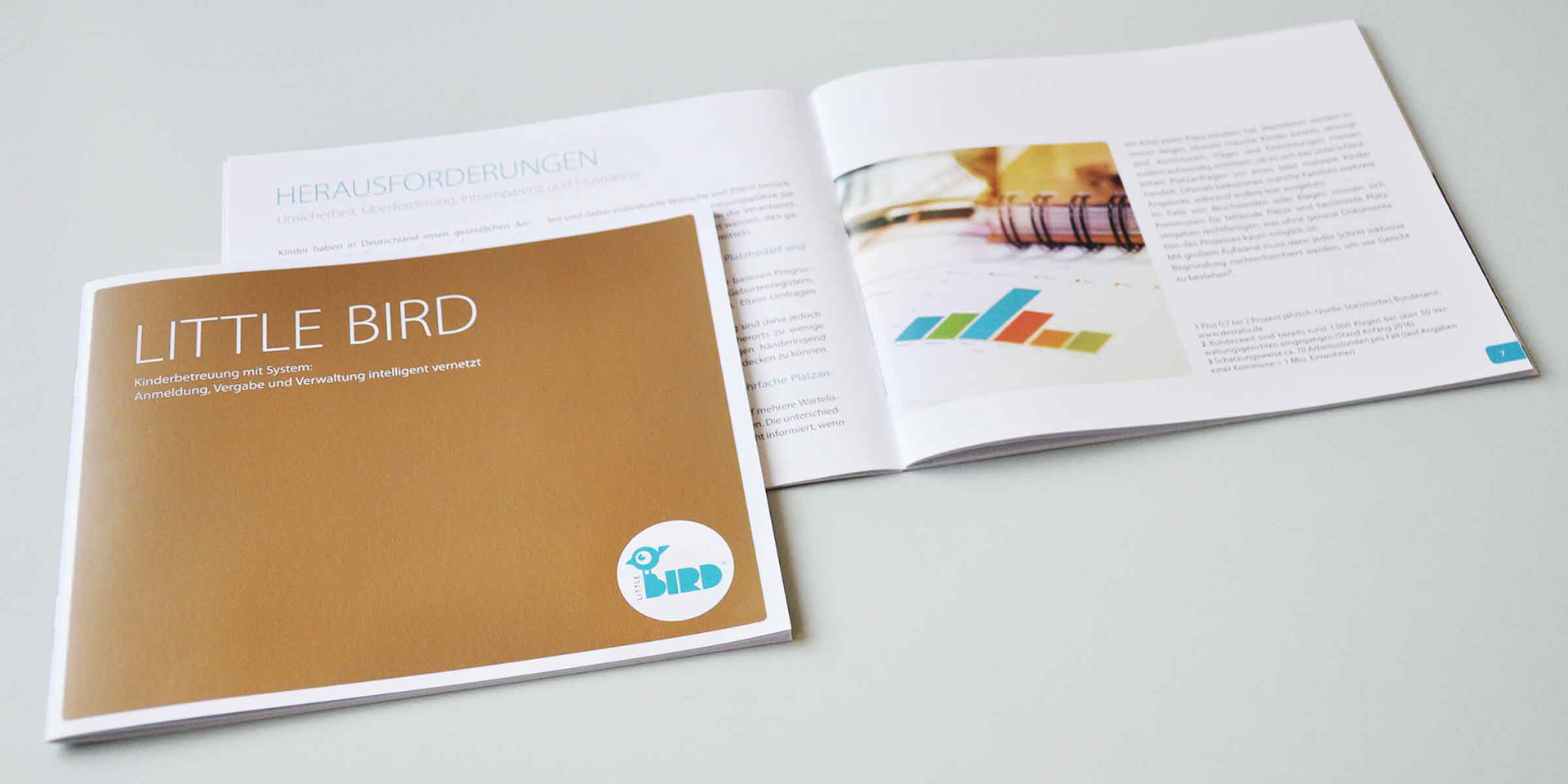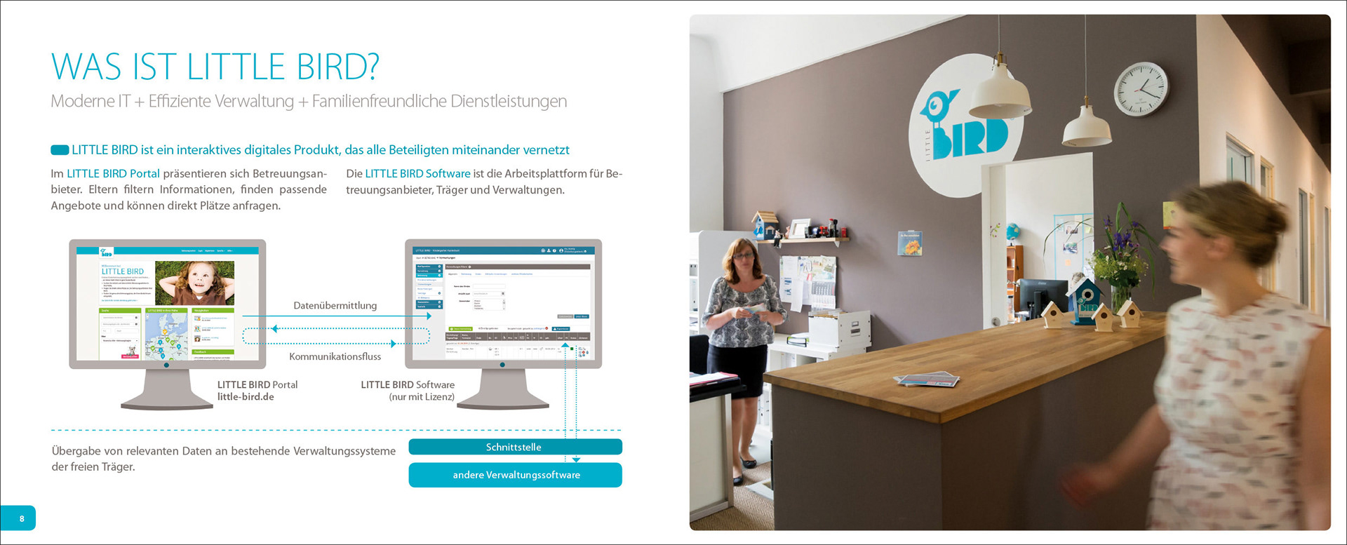Gestaltung einer Imagebroschüre für die Softwarefirma LITTLE BIRD, die deutschlandweit die Anmeldung, Vergabe und Verwaltung von Kinderbetreuungsplätzen digitalisiert.