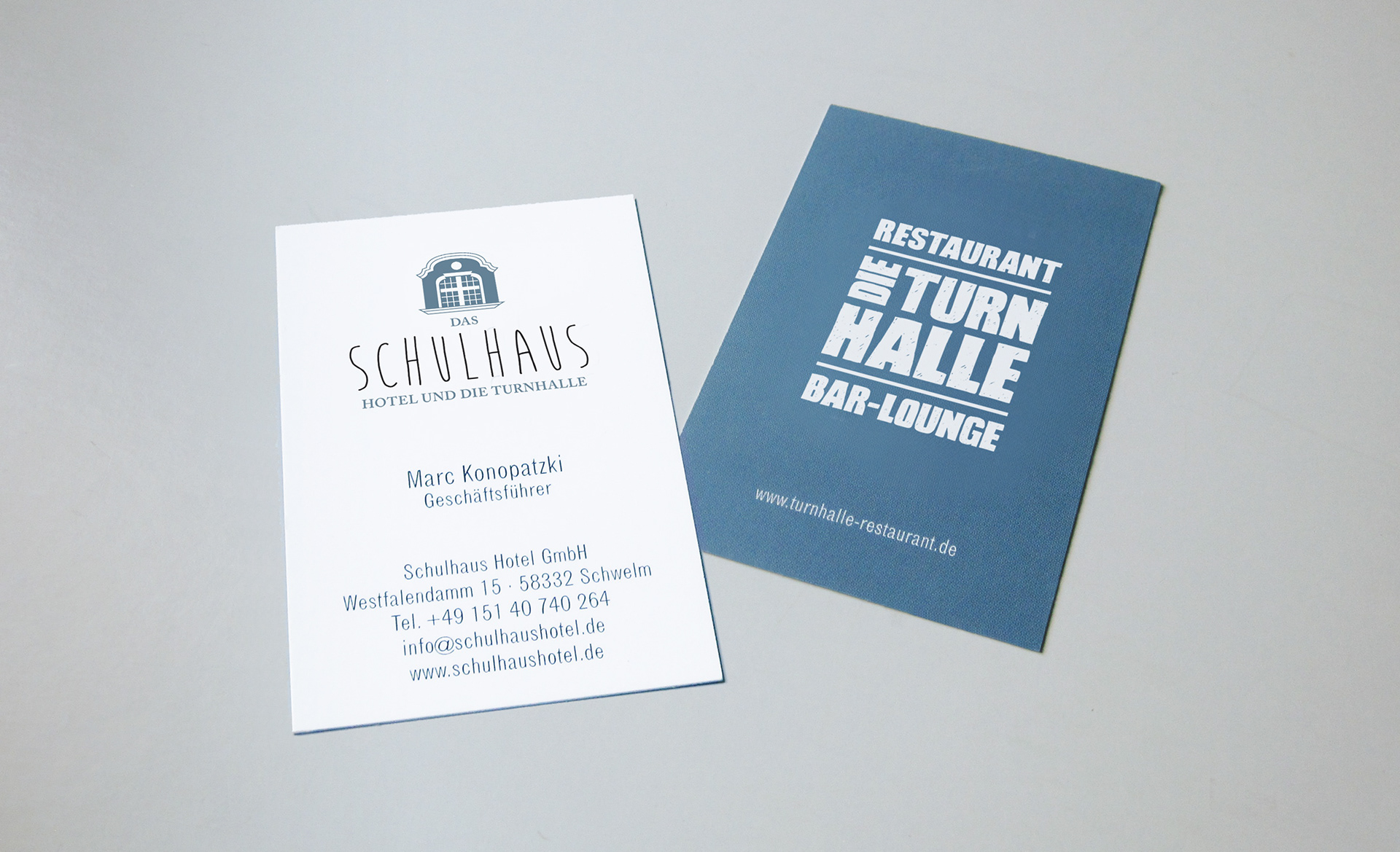 Für das Schulhaus Hotel, das in einem ehemaligen Schulgebäude seinen Platz findet, und das dazugehörige Restaurant Die Turnhalle gestaltete ich die Logos und Corporate Designs.